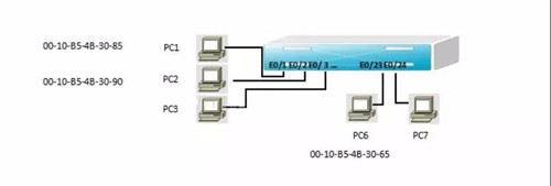 假設(shè)主機(jī)pc1向主機(jī)pc7發(fā)送一個數(shù)據(jù)幀,該數(shù)據(jù)幀被送到交換機(jī)后,交換機(jī)首先查MAC地址表,發(fā)現(xiàn)主機(jī)pc7連接在E0/24接口上,就將數(shù)據(jù)幀從E0/24接口轉(zhuǎn)發(fā)出去。